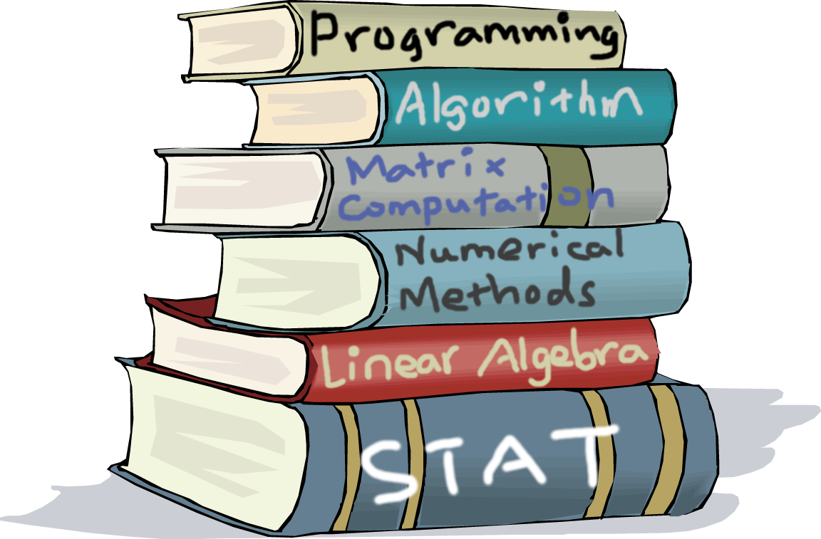 class: center, middle, inverse, title-slide .title[ # Computational Statistics ] .subtitle[ ## Lecture 1 ] .author[ ### Yixuan Qiu ] .date[ ### 2022-09-07 ] --- class: center, middle  --- class: inverse, center, middle # The Role of Computing --- # The Paradox Modern statistics and data science demand for novel and efficient computing algorithms - Big data break down many existing software packages - Solving complicated models are time-consuming - Hardware resources are not utilized in the most efficient way - High energy consumption but low performance --- # The Paradox However, computing has long been an underrated field in statistics - Researchers tend to spend more time on the theoretical properties of models and methods - Practitioners love to directly use software packages and care less about the computing details - Computing itself is less likely to be the primary object of study - .highlight[A carefully designed computing algorithm may be deemed merely a "trick" rather than solid contributions] --- class: center, middle ## .highlight[But doing it right is nontrivial] --- class: inverse, center, middle # Test Yourself --- **Q1.** Given two matrices `\(A_{n\times m}\)` and `\(B_{m\times n}\)`, compute `\(\mathrm{tr}(AB)\)`. -- Easy, isn't it? ```r sum(diag(A %*% B)) ``` -- .highlight[But this is REALLY bad!] -- ```r set.seed(123) A = matrix(rnorm(1000 * 2000), 2000) B = matrix(rnorm(1000 * 2000), 1000) system.time(sum(diag(A %*% B))) ``` ``` ## user system elapsed ## 2.24 0.00 2.24 ``` -- "My solution" takes 0.016 seconds. --- **Q2.** Let `\(f(x)\sim 0.3 \cdot N(-1, 0.1) + 0.7 \cdot N(1, 0.01)\)`. Write a function to evaluate `\(\log f(x)\)`. Test the result on `\(x=-15\)` and `\(x=15\)`. -- ```r logf = function(x) { f = 0.3 * dnorm(x, -1, sqrt(0.1)) + 0.7 * dnorm(x, 1, 0.1) log(f) } logf(c(-15, 15)) ``` ``` ## [1] -Inf -Inf ``` -- .highlight[Any better solution?] -- The correct results are -980.972, -1280.972. -- .highlight[What if we need] `\(\partial \log f(x)/\partial x\)`.highlight[, e.g., in Hamiltonian Monte Carlo?] --- **Q3.** Computing predicted values of linear regression `\(\hat{y}=X(X'X)^{-1}X'Y\)`. -- Literally translate the formula: ```r X %*% solve(t(X) %*% X) %*% t(X) %*% Y ``` -- .highlight[NEVER, ever, do this!] -- ```r set.seed(123) X = matrix(rnorm(5000 * 500), 5000) Y = rnorm(5000) system.time(X %*% solve(t(X) %*% X) %*% t(X) %*% Y) ``` ``` ## user system elapsed ## 9.31 0.08 9.39 ``` -- "My solution" takes 0.690 seconds. --- **Q4.** Computing the operator norm of a matrix `\(A_{m\times n}\)`, `\(m<n\)`. `\(\Vert A\Vert_{\mathrm{op}}=\sqrt{\lambda_\max(A'A)}\)`. -- By definition: ```r sqrt(eigen(t(A) %*% A)$values[1]) ``` -- .highlight[How fast is it on a matrix of size, say, 1000 x 2000?] -- ```r set.seed(123) A = matrix(rnorm(1000 * 2000), 1000) system.time(sqrt(eigen(t(A) %*% A)$values[1])) ``` ``` ## user system elapsed ## 16.94 0.03 17.02 ``` -- .highlight[Any method to accelerate it?] -- "My solution" takes 0.322 seconds. --- ## Do you still think computing is trivial? - Perhaps you have already used such "bad" code in your projects - But maybe you have not identified the issues in these examples yet - .highlight[If this is the case, then this course is going to help you!] --- class: inverse, center, middle # Why We Study Computing --- # Studying Computing - It boosts modern statistical research - Many problems are not yet well resolved and are good research topics - It helps us to make the best use of computational resources - It is fun! --- # Some (Loose) Definitions <sup><span class="small">[1]</span></sup> - .highlight[Statistical Computing]: Computational methods that enable statistical methods - .highlight[Computational Statistics]: Statistical computing + statistical methods that are computationally intensive --- # Scope Statistical computing is a multidisciplinary field - Statistics - Computer science - Numerical analysis - Optimization - Database - Programming - Graphics - Software engineering - Reproducible research - ... --- # Scope Computational statistics builds on top of mathematical statistics, statistical computing, and applied statistics - Everything that appears in the previous slide - Monte Carlo simulation - Bootstrap/resampling techniques - EM algorithm - Density estimation - Computational optimal transport - ... --- # Scope - This course would primarily focus on fundamental computing techniques - Will also discuss some advanced topics in modern computational statistics --- # Fundamental Problems - Numerical Linear Algebra - Computations on matrices and vectors - Optimization - Minimizing objective functions - Simulation/Sampling - Generating random numbers from statistical distributions --- class: inverse, center, middle # Roadmap --- # Principle - We will introduce numerical tools that are useful in statistical computing - We may not elaborate the details of every algorithm, but will introduce its motivation and function - You do not need to be an expert on each method - But you need to know their existence, so that you can quickly recall them when you encounter a related problem --- # Course Projects - Some important methods and algorithms will be left as homework or course projects - Understand the details well - Go through and verify the theoretical properties - Implement the algorithm correctly and efficiently --- # Topics on Numerical Linear Algebra - Triangular and tridiagonal systems - LU decomposition - Cholesky decomposition - Conjugate gradient method - `\(LDL^T\)` decomposition - QR decomposition - Eigenvalue/Singular value decomposition - Basic sparse matrix operations --- # Topics on Optimization - (Sub)Gradient descent and projected (sub)gradient descent - Newton's method - Proximal gradient descent - L-BFGS and L-BFGS-B - Douglas-Rachford splitting - ADMM --- # Topics on Simulation and Sampling - Univariate random number generation - Rejection sampling - Importance sampling - Markov chain Monte Carlo - Measure transpo